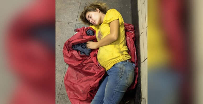 A woman was curled up on the dirty floor near the back of the car, using a torn jacket as a blanket. She was obviously pregnant, and her hair was matted and unwashed.