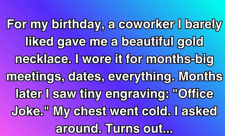 For my birthday, a coworker I barely knew gave me a glittery gold necklace. I wore it everywhere, feeling elegant—until months later, I noticed a tiny engraving on the back: “Office Joke.” My chest went cold. Turns out, a few teammates had bought it as a prank gift for someone they thought was “trying too hard.” Apparently, that was me. I laughed along when they told me, then cried alone in a bathroom stall.