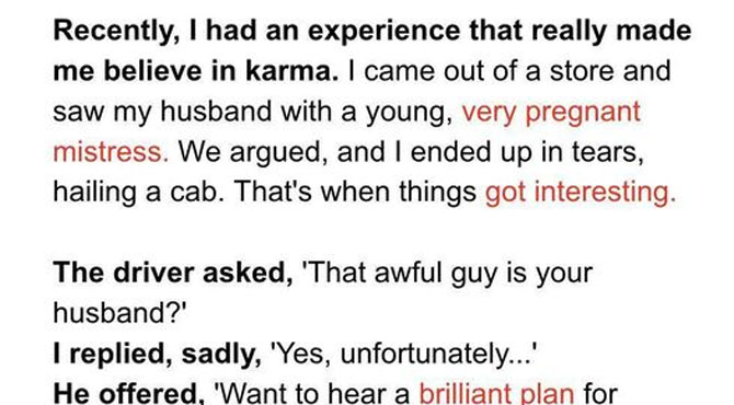 The driver chuckled. “Perfect. Here’s what you do: when their baby is born, you should take a stick and—” He paused for dramatic effect. “—draw a line in the sand, because that’s the day karma will start doing its work for you.”