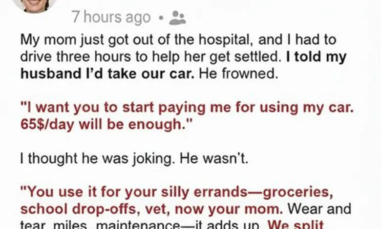 When my mom had a stroke, I planned to spend three days helping her adjust at home. I asked my husband, Liam, if I could take the car we shared every day. Without looking up from his phone, he said, “Sure—$65 a day.” In that moment, I didn’t feel like his wife or the mother…